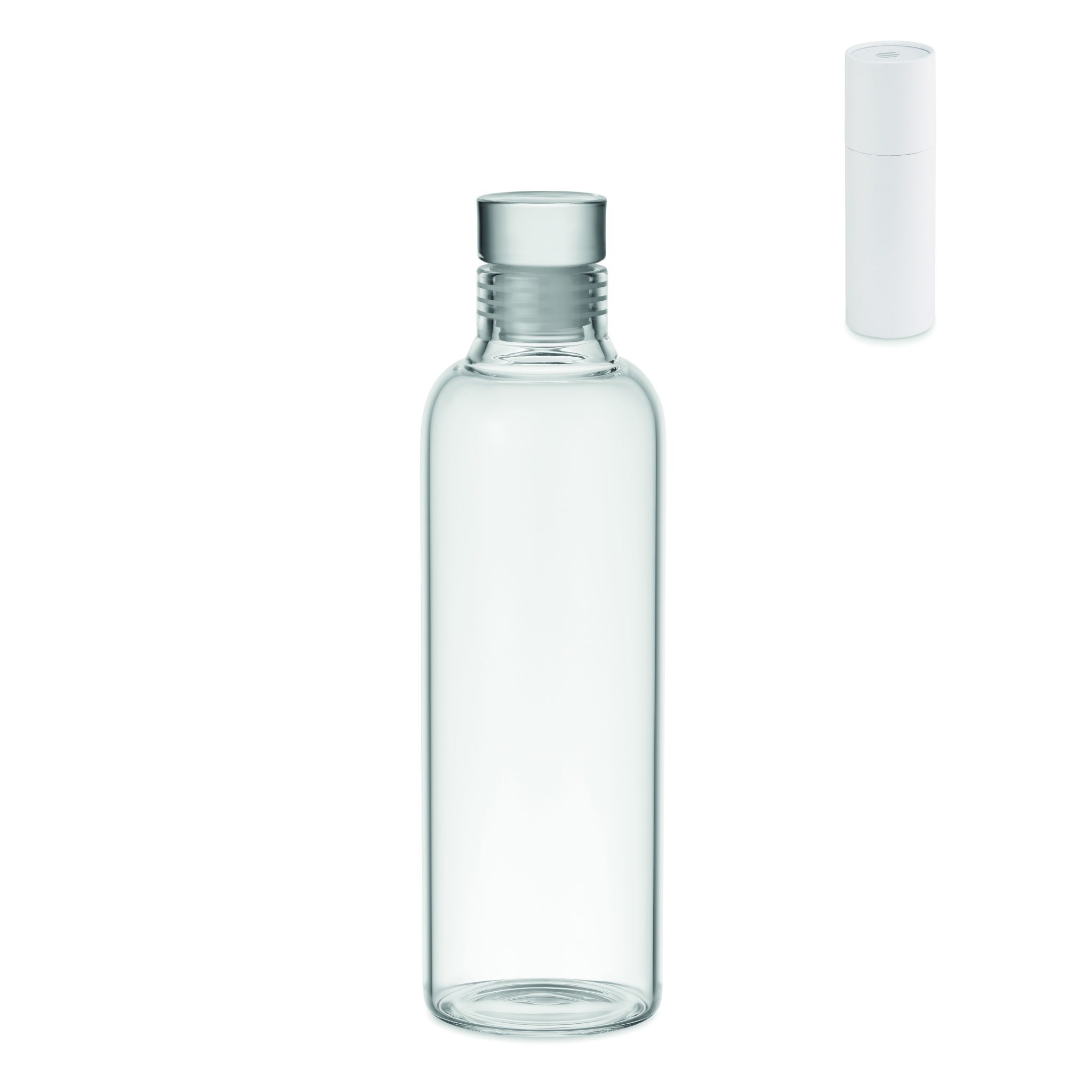 Flasche aus Borosilikatglas mit auslaufsicheren Verschluss aus Glas. Präsentiert in einer Karton-Hülse. Füllmenge: 500 ml.