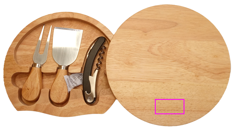 Käsebrett aus Holz (Gummibaumholz), inklusive Käsemesser, Käsegabel und Kellnermesser. Ihre Werbung gravieren wir auf das Brett.