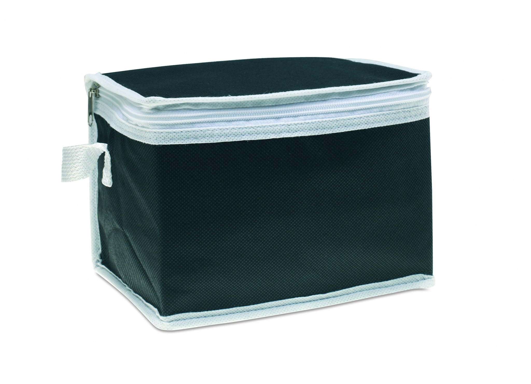 Kühltasche mit isolierender Aluminium-Folie für 6 Dosen. Außenseiten Non Woven mit weißen Absetzungen. 80 g/m². Isoliermaterial: Mit Aluminiumfolie laminierter Schaumstoff. Füllmenge 3L.