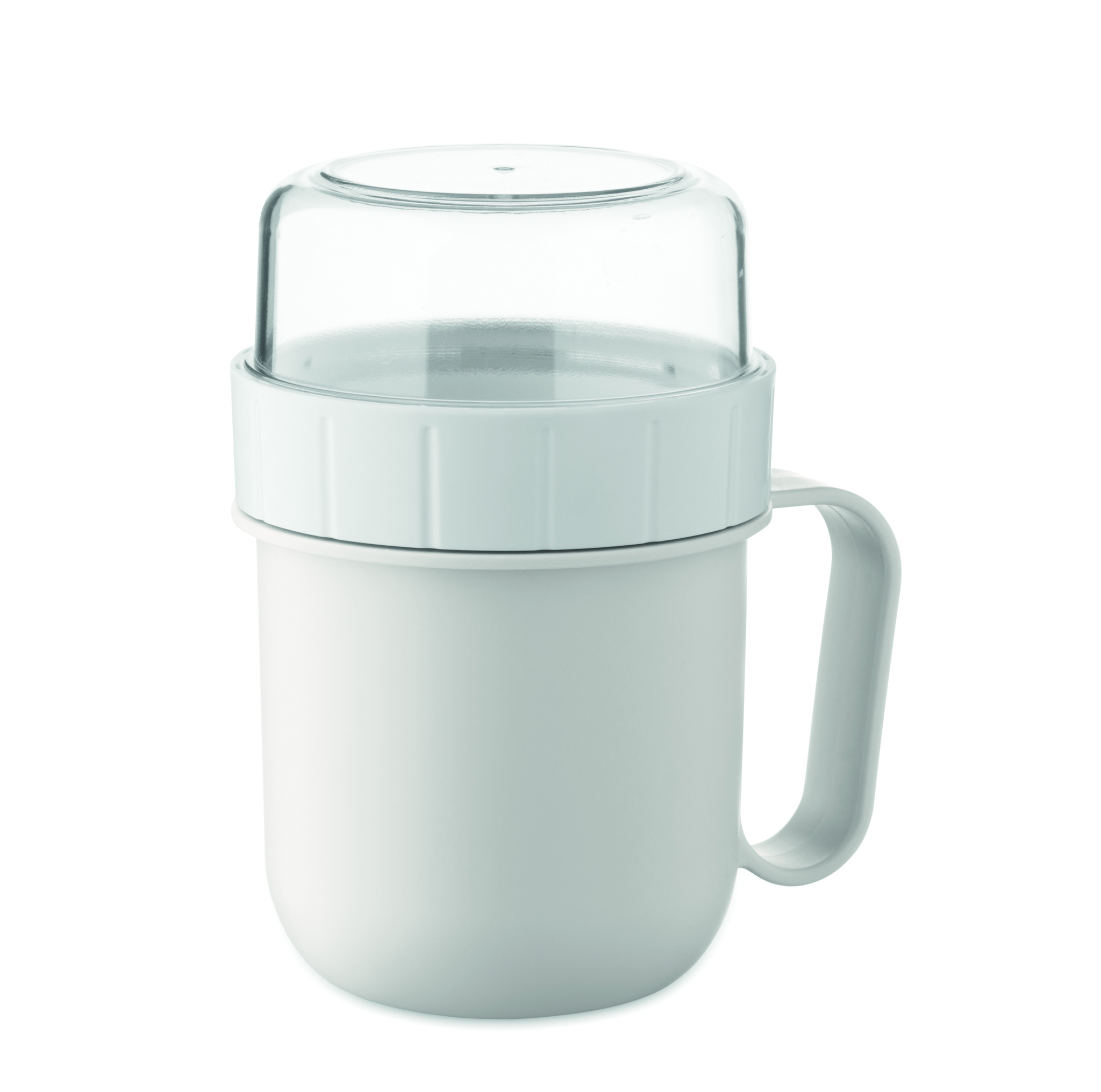 Brunch- oder Müslibecher für unterwegs. 2 PP-Behälter, um die Zutaten getrennt aufzubewahren. Deckel aus PS. Füllmenge: 450 ml und 160 ml. Auslaufsicher.