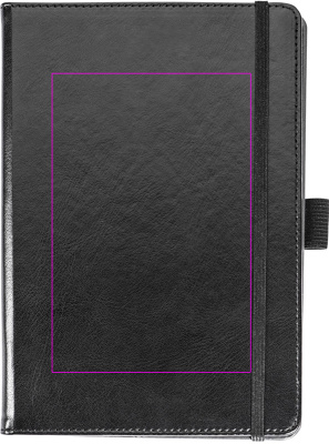 A5 notebook in leather imitation, with 80 lined pages, 4 slide-in compartments and pen loop. We will print your logo on the cover.