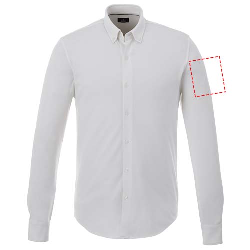Self fabric collar. Stretch fabric. Adjustable cuff with single pleat. Button-down collar. Satin piping at inside neck. Dyed-to-match engraved buttons. Woven main label.