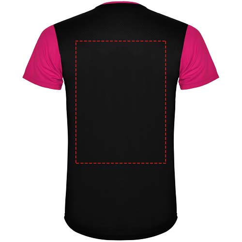 Easy-dry, technical and breathable fabric. Crew neck. Combination of two polyester fabrics on the back and shoulders. Bird's eye fabric on front and breathable 3D mesh fabric at the back. Fabric prepared for moisture absorption. Decorative zigzag backstitch on sides and shoulders. Back pattern slightly longer. Removable label.