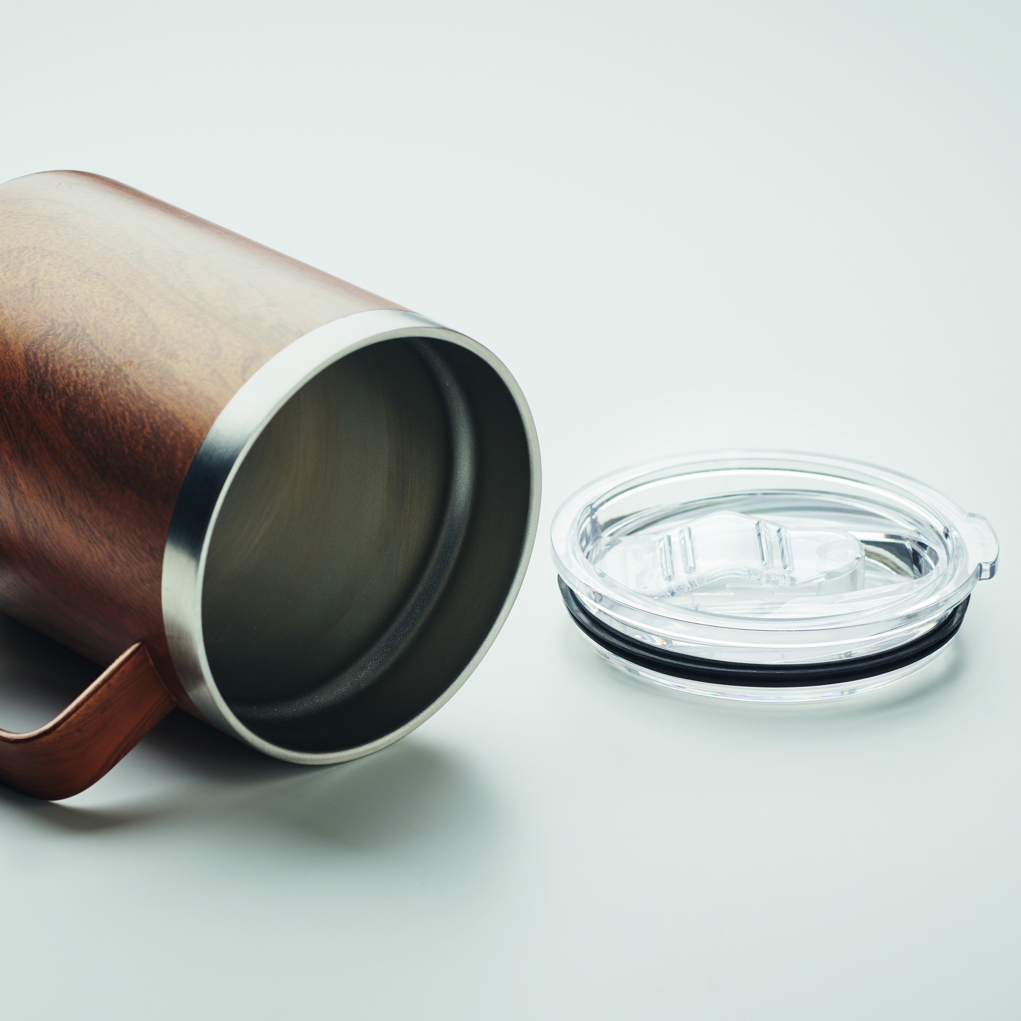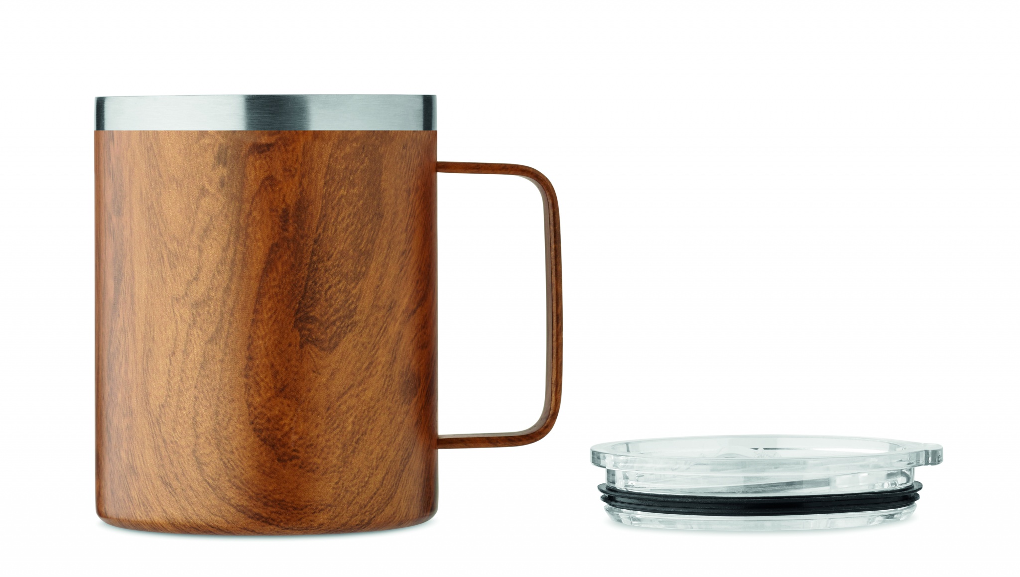 Double wall recycled stainless steel (90% recycled stainless and 10% stainless steel) mug with wooden look and sliding sip hole cover. Capacity: 300 ml.