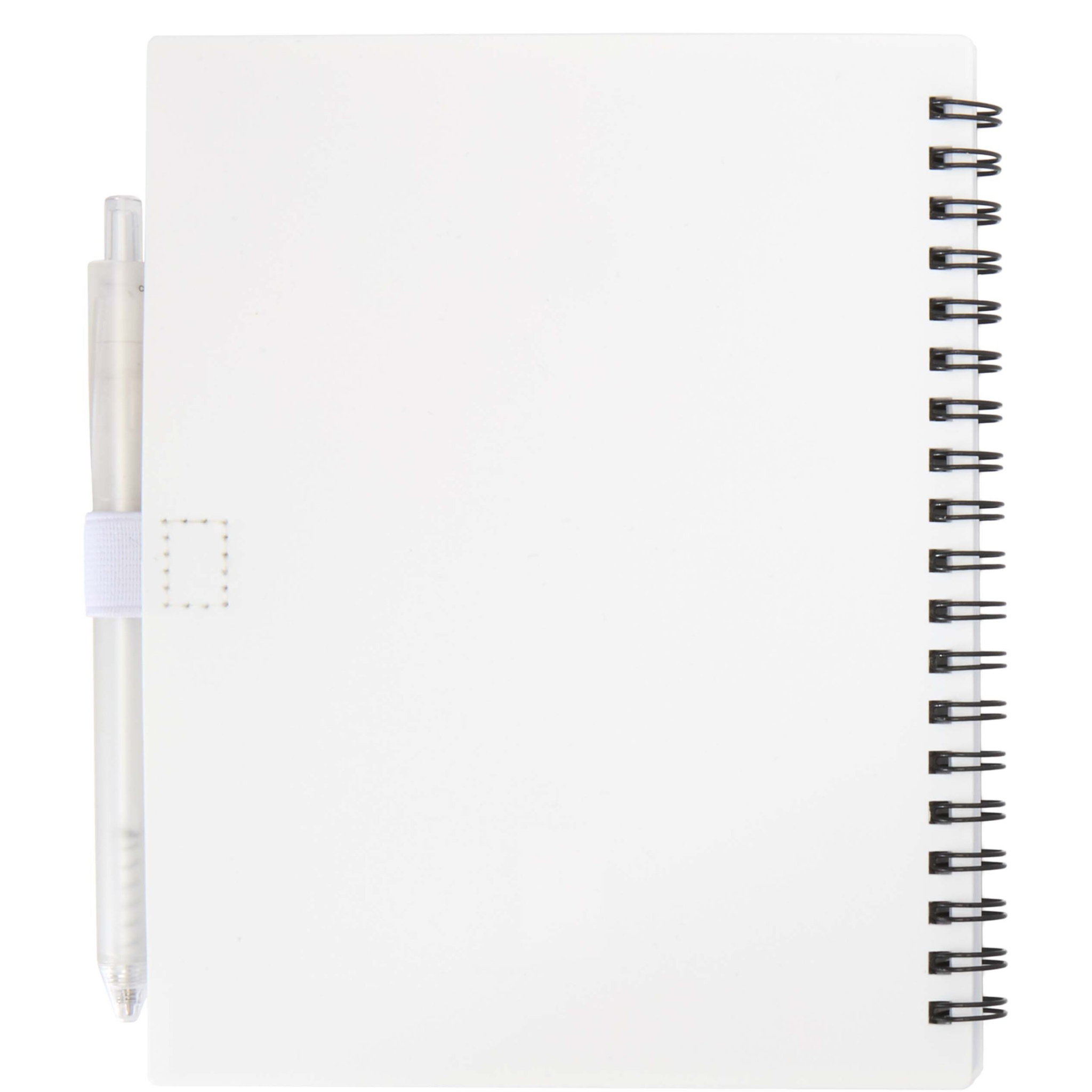 The Niove soft cover notebook is made of recycled plastic with 70 dotted sheets of 70 g/m² paper. The notebook has square corners and a pen loop. Notebook size: 140 x 178 mm. The ballpoint pen is also made of recycled plastic. Ink colour: Blue. Writing length: 1000 meters. Nib size: 1.0 mm.