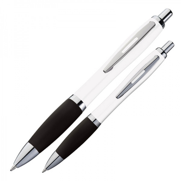 Ballpoint pen with white barrel, metal clip, blue writing large capacity refill and colored soft touch grip zone. We print your logo on the right side of the clip.