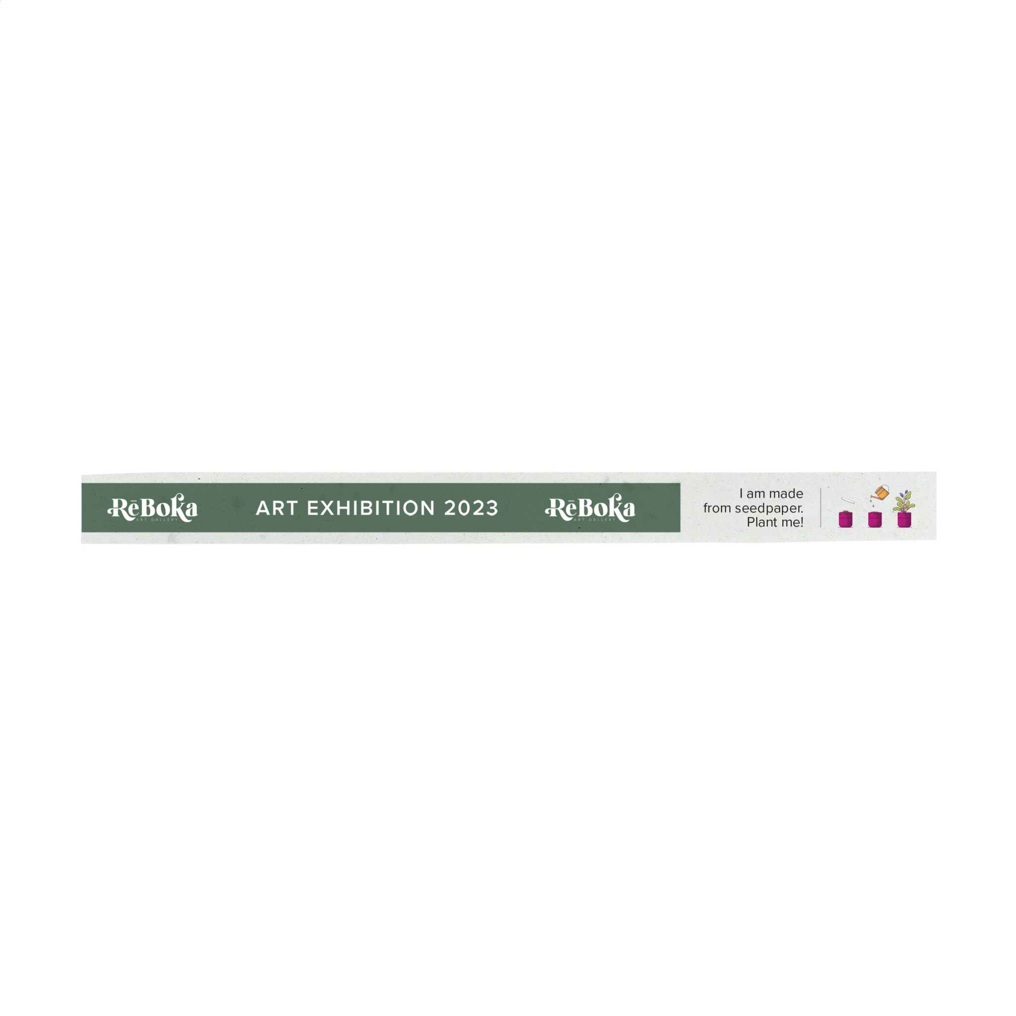 WoW! A festival band made from 100% recycled and recyclable seed paper which can be planted to grow flowers after use. With an adhesive strip closure. Including full colour imprint on one side. The perfect solution for controlling access to events and festivals. Promotional and functional. A mix of flower seeds is glued between two layers of recycled waste paper (40 g/m²). When the event is over you can plant the biodegradable strap and watch the seeds grow into flowers. The field flower mix consists of: Feverfew (daisy) – Veilweed – Snapdragon – Crooked Flower – Silver Shield – Mexican – Petunia – Salvia – Summer Azalea – Ice Flower. An environmentally friendly gift that also contributes to maintaining a healthy bee population.