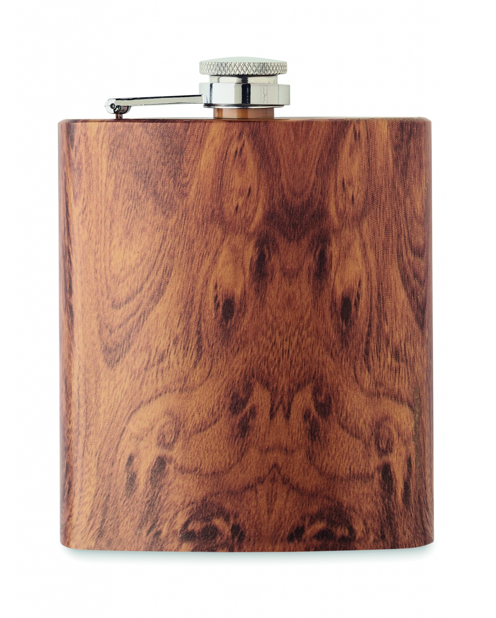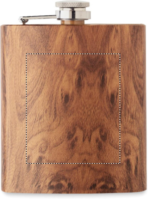 Slim hip flask in recycled stainless steel (90% recycled stainless and 10% stainless steel) with a wooden look. Capacity 190 ml.