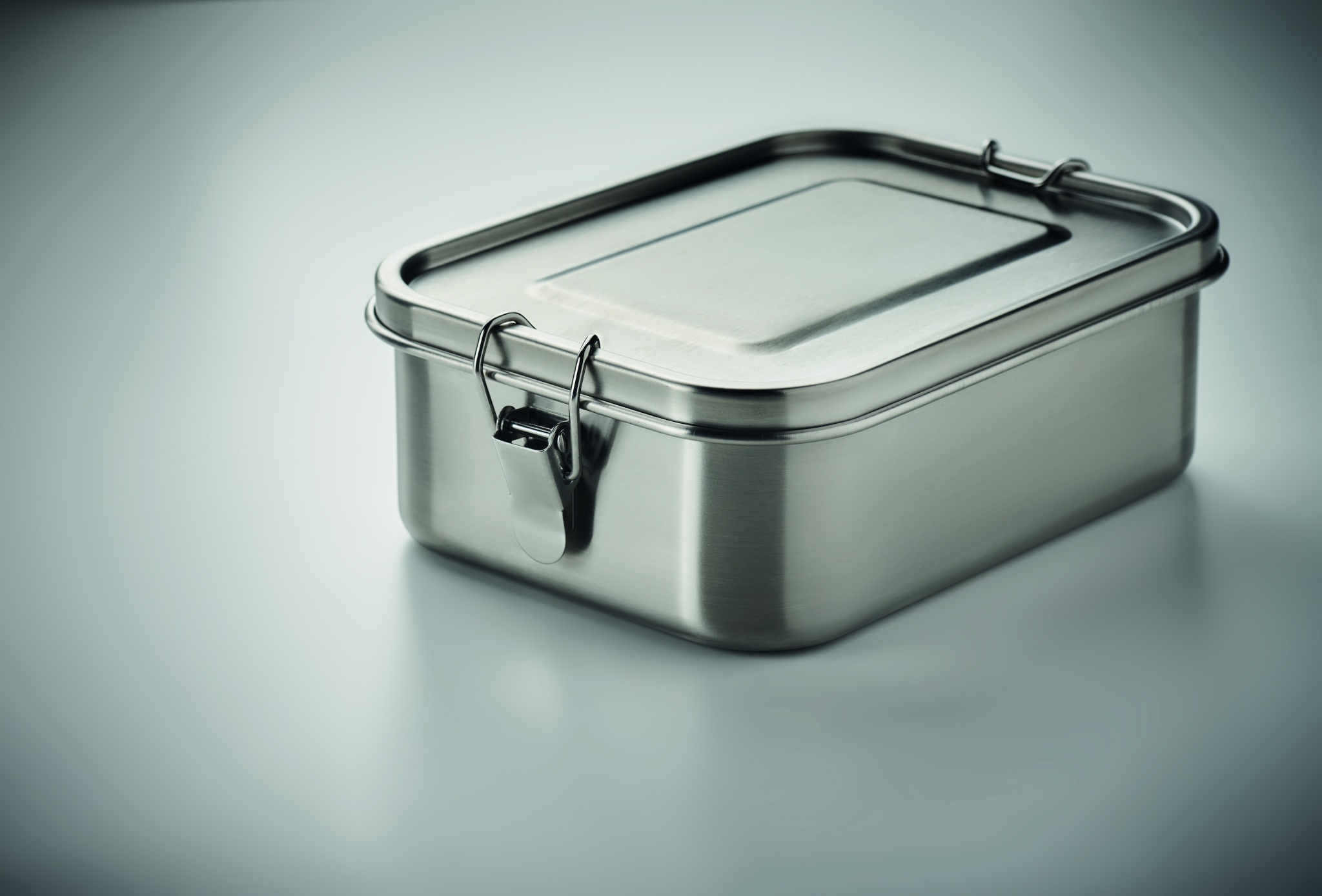 Stainless Steel lunch box with strong and secure side buckles. Including inner divider. Capacity: 1200 ml.
