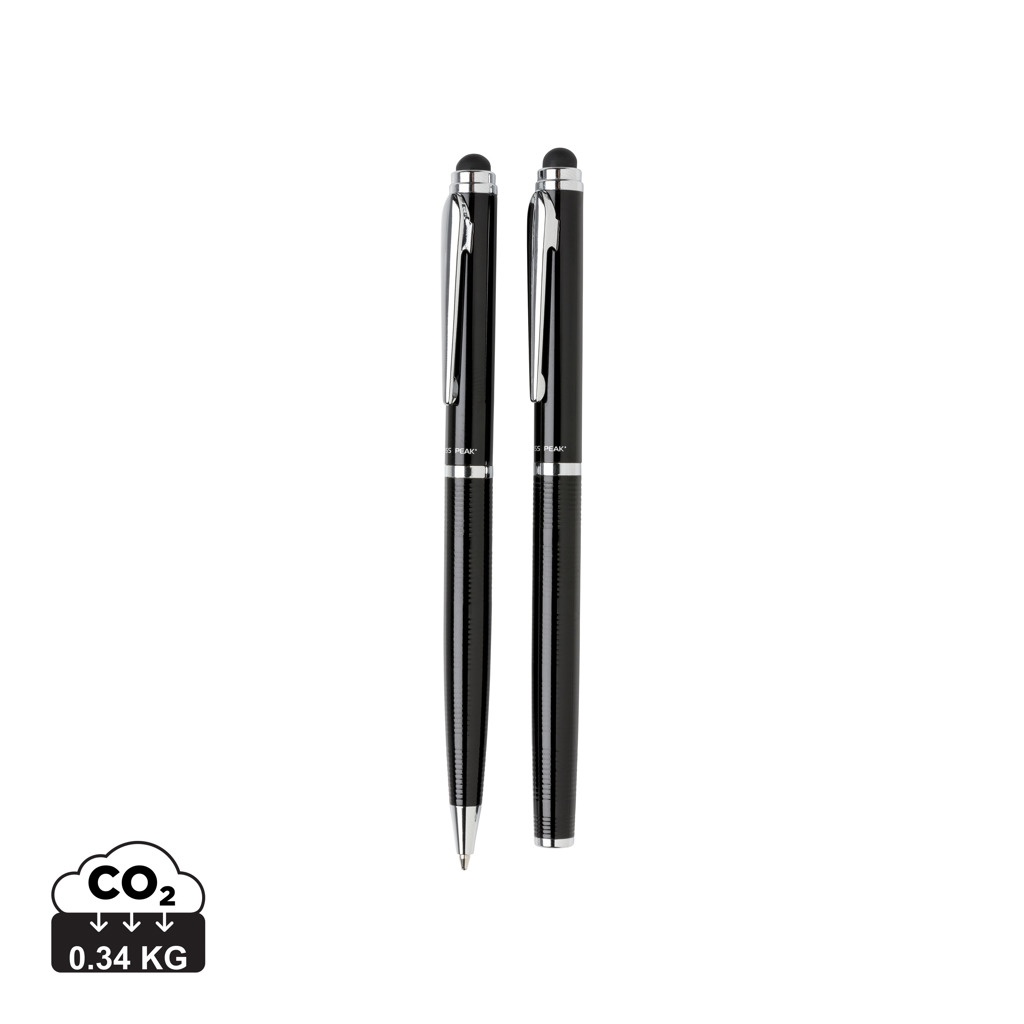 Stylus ballpoint pen and stylus rollerball gift set. Exclusive design with beautiful lined barrel pattern and a dedicated place for printing your decoration. Incl. Swiss Peak tube giftbox.