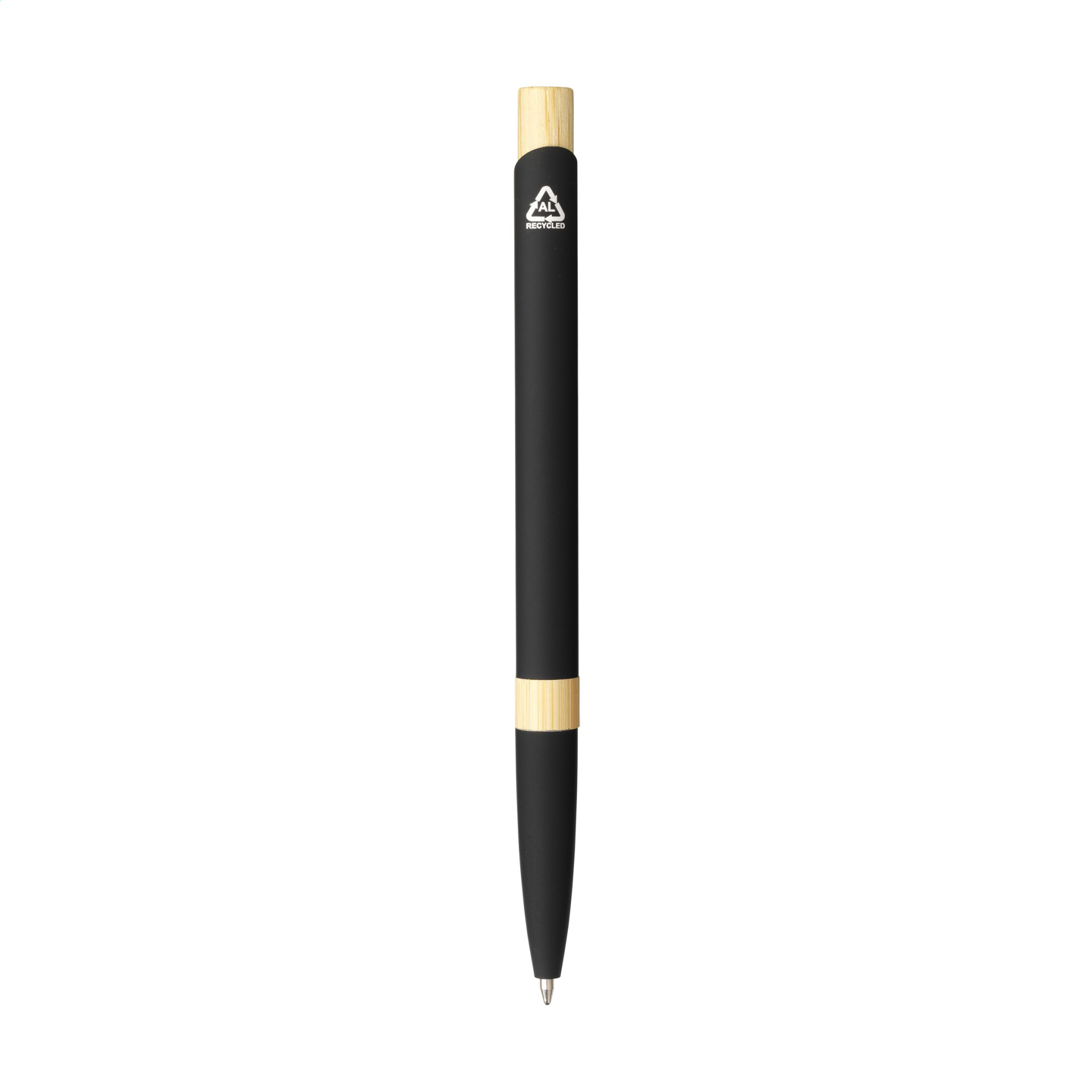 WoW! Blue ink, slim ballpoint pen with recycled aluminium barrel with a rubberised finish and sturdy metal clip. The bamboo accents give the pen a natural character. GRS-certified. Total recycled material: 73%. The use of recycled aluminium means that fewer new raw materials are used in production. This means less energy consumption and less use of water. A responsible choice.