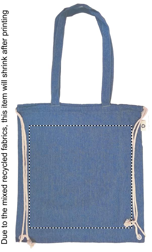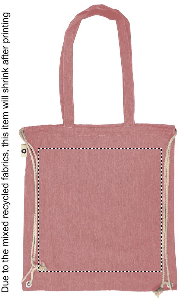2-tooniline taaskasutatud puuvillast ja taaskasutatud polüestrist poekott pingutusnööri ja pikkade sangadega (20%/80%). u. 140 gr/m². See üksus võib pärast printimist kokku tõmbuda.