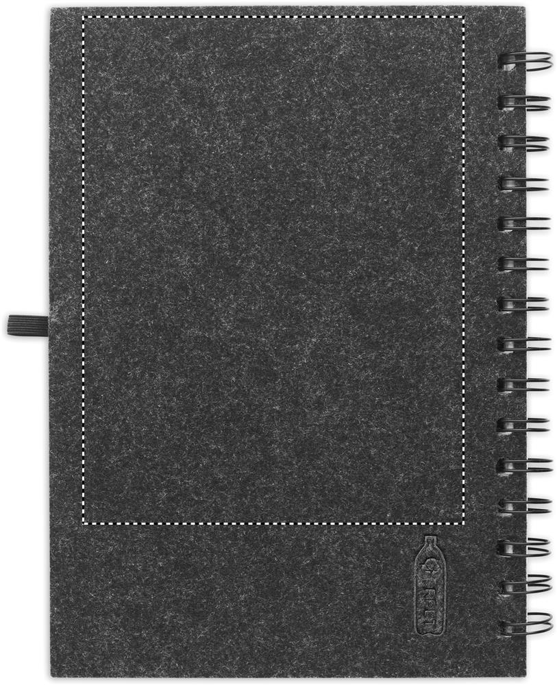 A5 RPET vildist kaanega märkmik. Kahe traadiga köidetud, 160 taaskasutatud joonega lehte 70 gr/m² (80 lehte) elastse pliiatsihoidjaga.