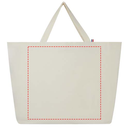 See suure mahutavusega kandekott on valmistatud parimatest, 100% taaskasutatud materjalidest. See on ehitatud igapäevaelus kasutamiseks ja sobib raskete raamatute või toidukaupade kaasaskandmiseks. 200 g/m² taaskasutatud puuvilla/polüestri segu tagab vastupidavuse ja töökindluse, andes kotile vastupidavuse kuni 14 kg kaalule. Lõngad pärinevad Aasiast, kuid kudumine, ketramine ja tootmine toimub Prantsusmaal.
