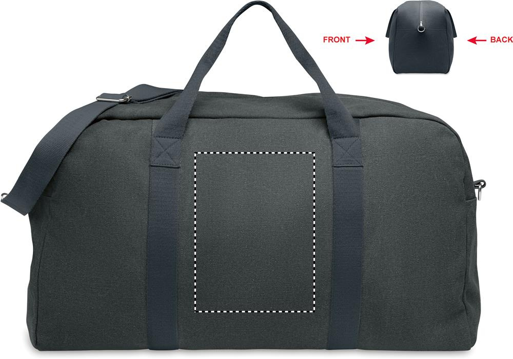 Must taaskasutatud 450 gr/m² kangast (60% taaskasutatud puuvill ja 40% taaskasutatud polüester) reisikott reguleeritava ja eemaldatava puuvillase rihmaga.