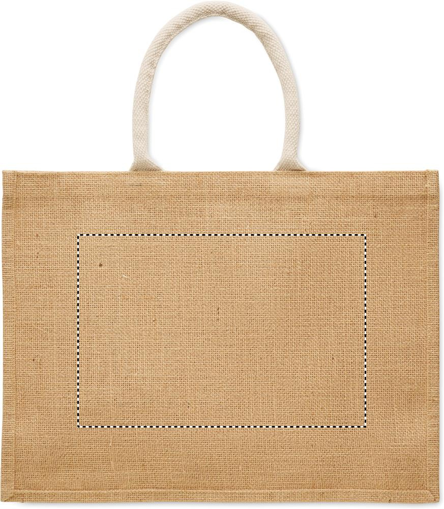 Lamineeritud džuudist ja 280 g/m² puuvillasest lõuendist ostukott nöörkäepidemetega. Sisaldab suurt avatud esitaskut.