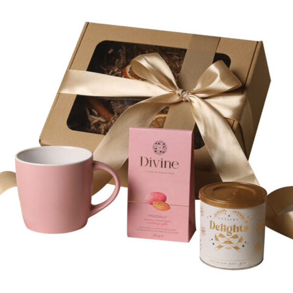 Komplekt sisaldab: kruusi, pralineed – mandlid šokolaadis vaarikapulbriga (roosa) / mandlid šokolaadis kookosega (sinine) / apelsinikoor tumešokolaadis (hall), magustoidud "Delights" – mustsõstrad valges šokolaadis vaarikapulbriga. Kõik pakendatud stiilsesse aknaga ökopapist karpi.