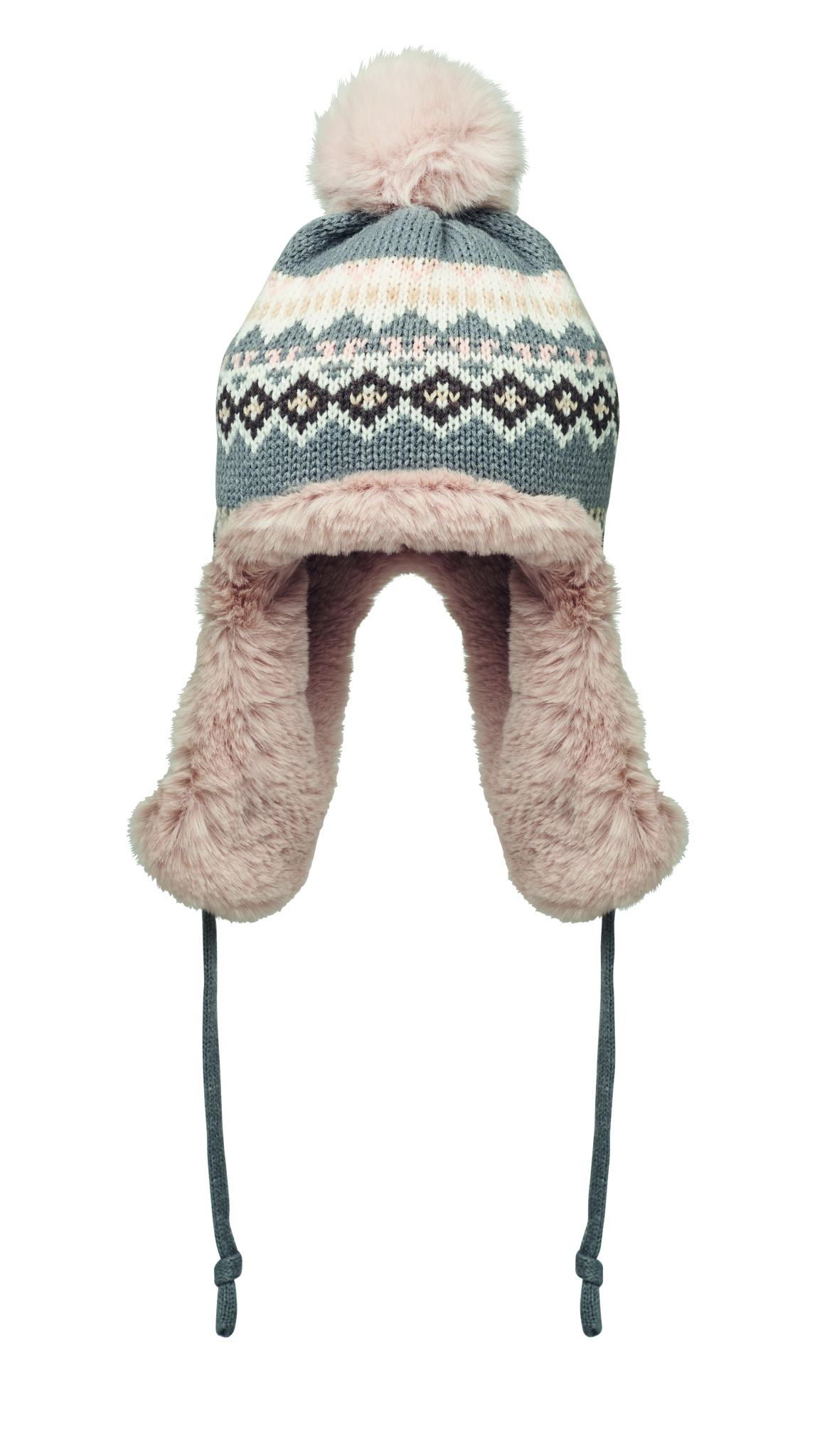 Kootud akrüülkiust müts kõrvapealsete klappide ja tutiga, polüestri ja fliisiga vooderdatud. Ühel küljel on embleem trükialaga. Täiskasvanute suurus.