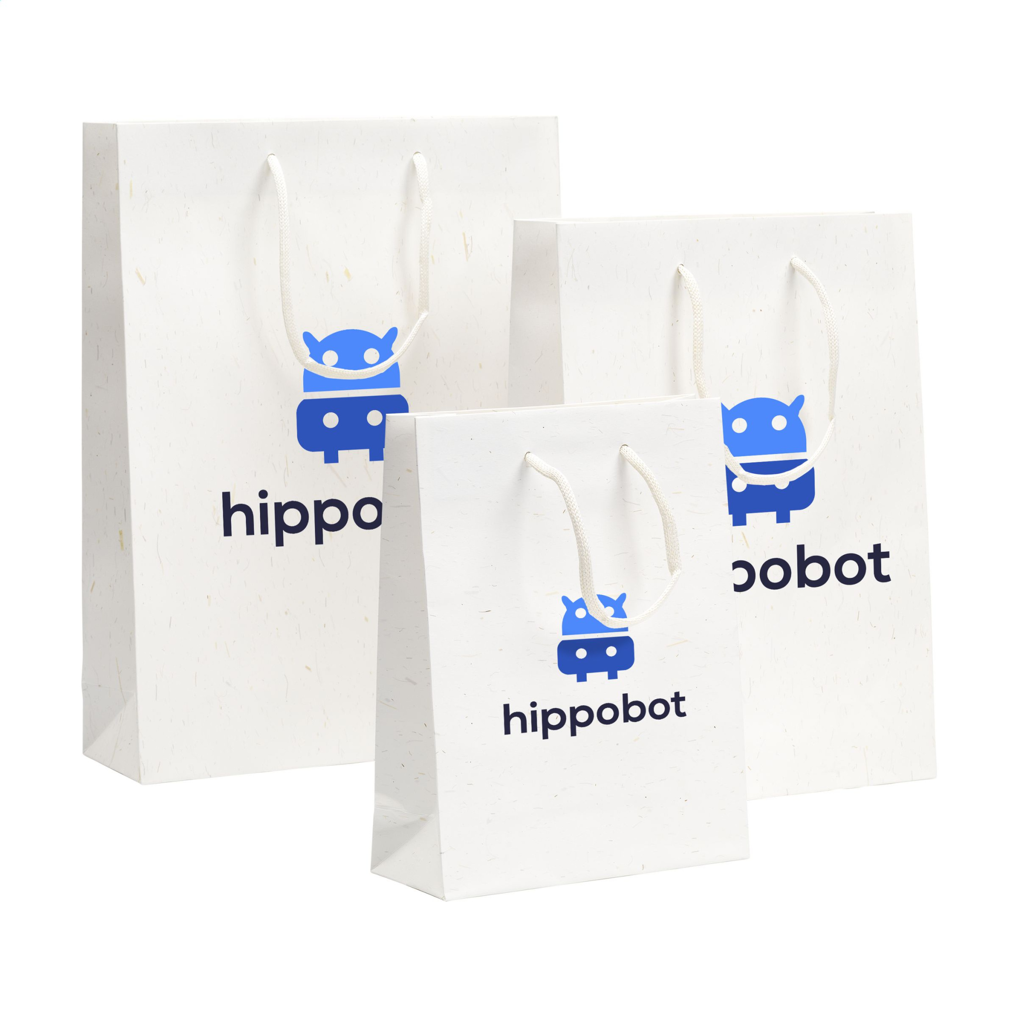 Vau! Tugev ECO-paberist kingikott (suurus M), mis on valmistatud põhukiududega taaskasutatud paberist (180 g/m²). Tänu looduslike kiudude kasutamisele on iga kott unikaalne ja paberil on näha ebatasasusi. See annab tootele kauni loomuliku välimuse. Igal kotil on kaks lühikest, paberist kootud kandeaasa, volditud põhi ja külgvolt. Sobib igasugusteks reklaamieesmärkideks. Selle koti tootmiseks puid maha ei võeta.