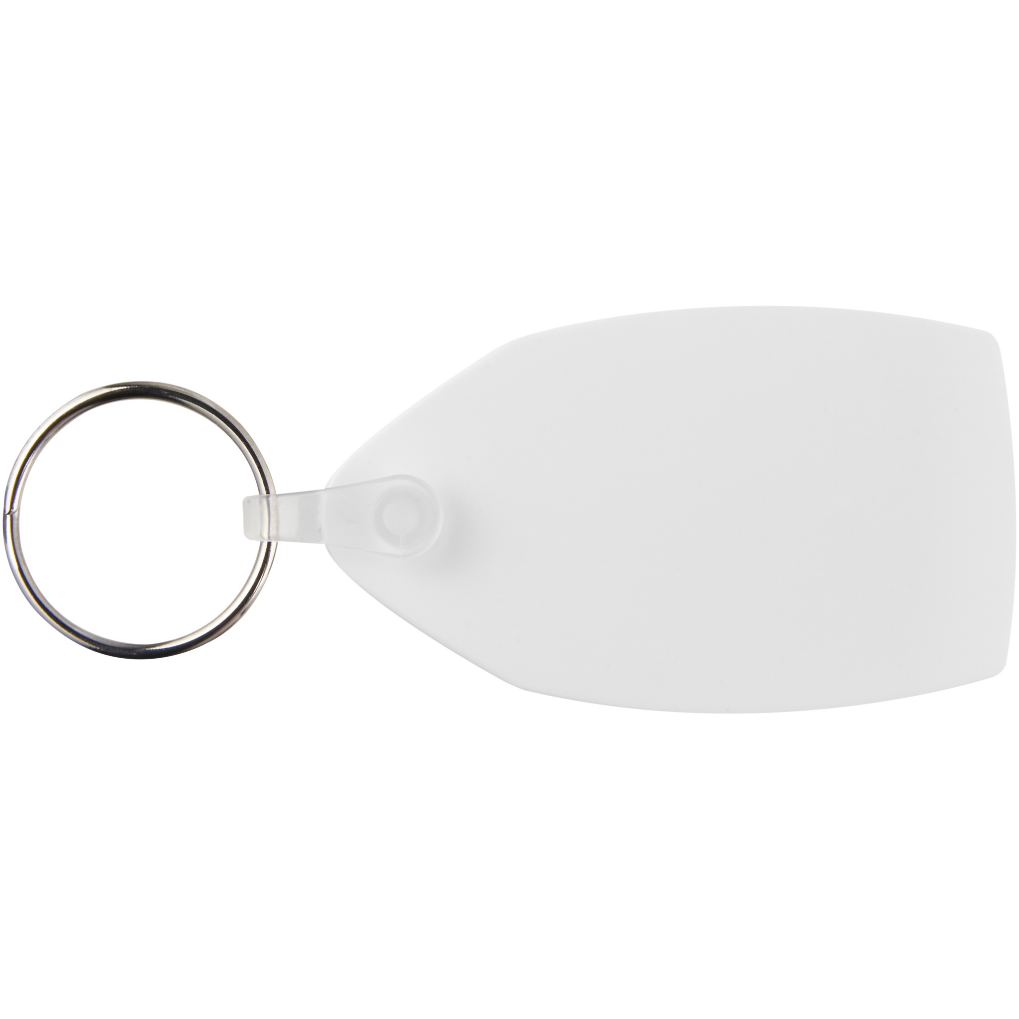 Valge ristkülikukujuline võtmehoidja metallist poolitatud võtmehoidjaga. Metallist silmusrõngas pakub lamedat profiili, mis sobib ideaalselt postitamiseks.