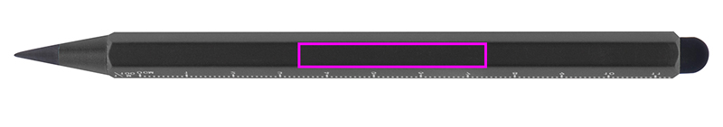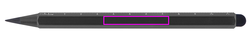 Alumiiniumist tindita pliiats puutefunktsiooni ja skaalaga cm ja tollides. Plii on valmistatud grafiidi ja metalli segust, mis muudab selle äärmiselt vastupidavaks. Teie logo graveeritakse tünni vabale kohale.