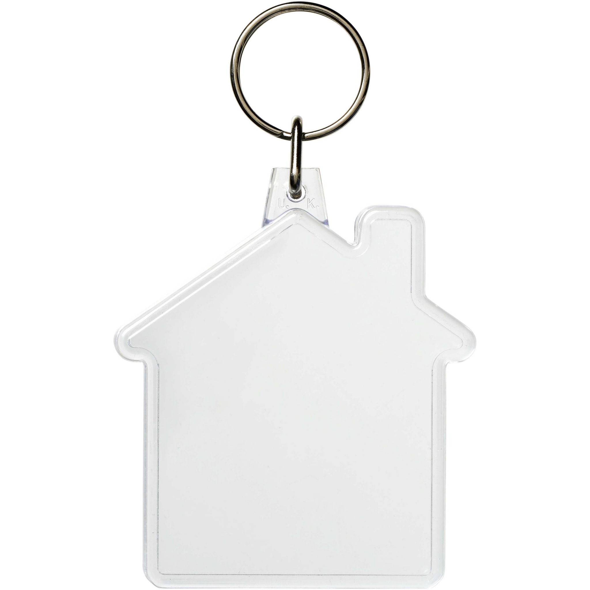 Kirkas talonmuotoinen avaimenperä, jossa on metallinen avainrengas. Metallirengas tekee profiilista litteän, mikä on ihanteellista postituksen kannalta. Tulosteinsertin mitat: 5,9 cm x 5,6 cm.