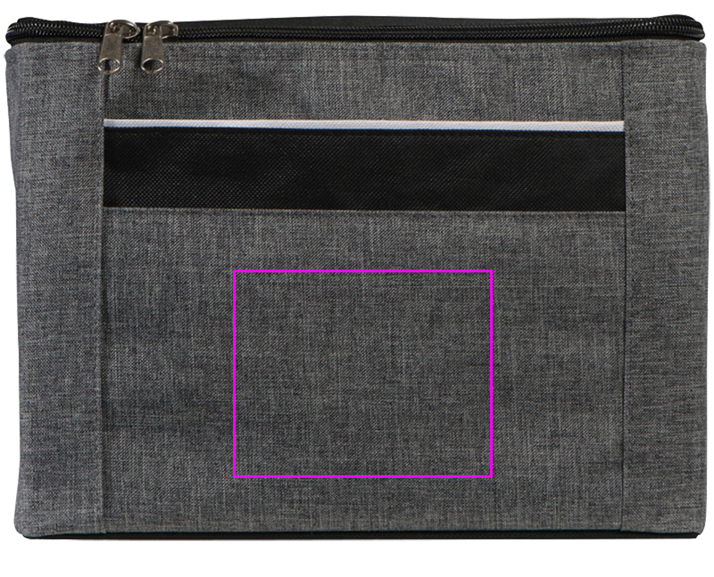 300D+600D polyesterikylmälaukku kantokahvalla, vetoketjukiinnitys, paikka kuudelle 500 ml:n tölkille tai pullolle ja logolla painettu etuosasto.