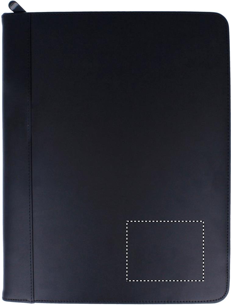 A4 kansio vetoketjulla, nahkapäällisellä ja PU-pohjalla. Sisältää 25 sivuisen muistilehtiön.