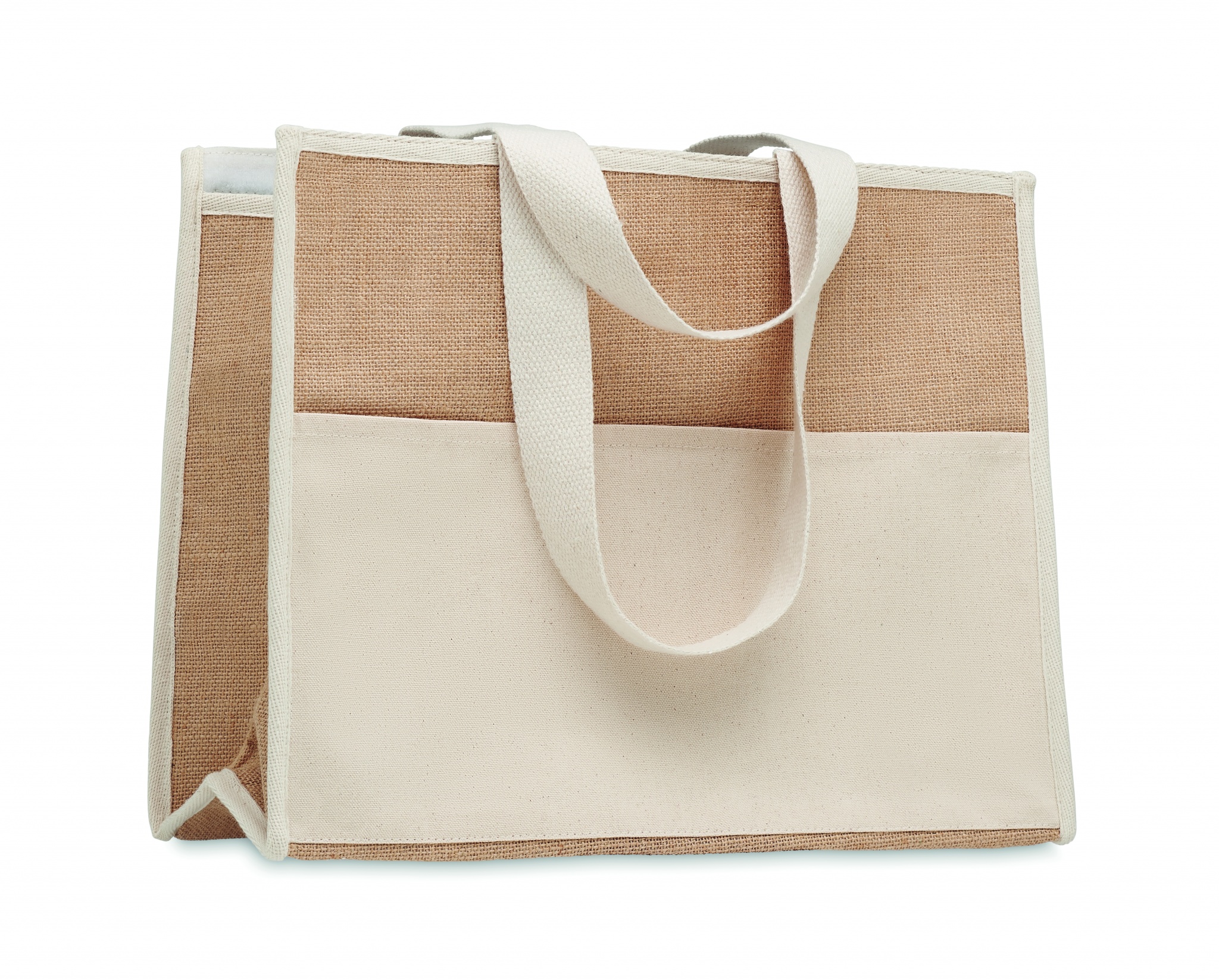 Juutti kylmälaukku, laminoitu sisäosa pitää tavarasi tuoreena. Pitkät kahvat, tarrakiinnitys ja edessä canvas tasku.