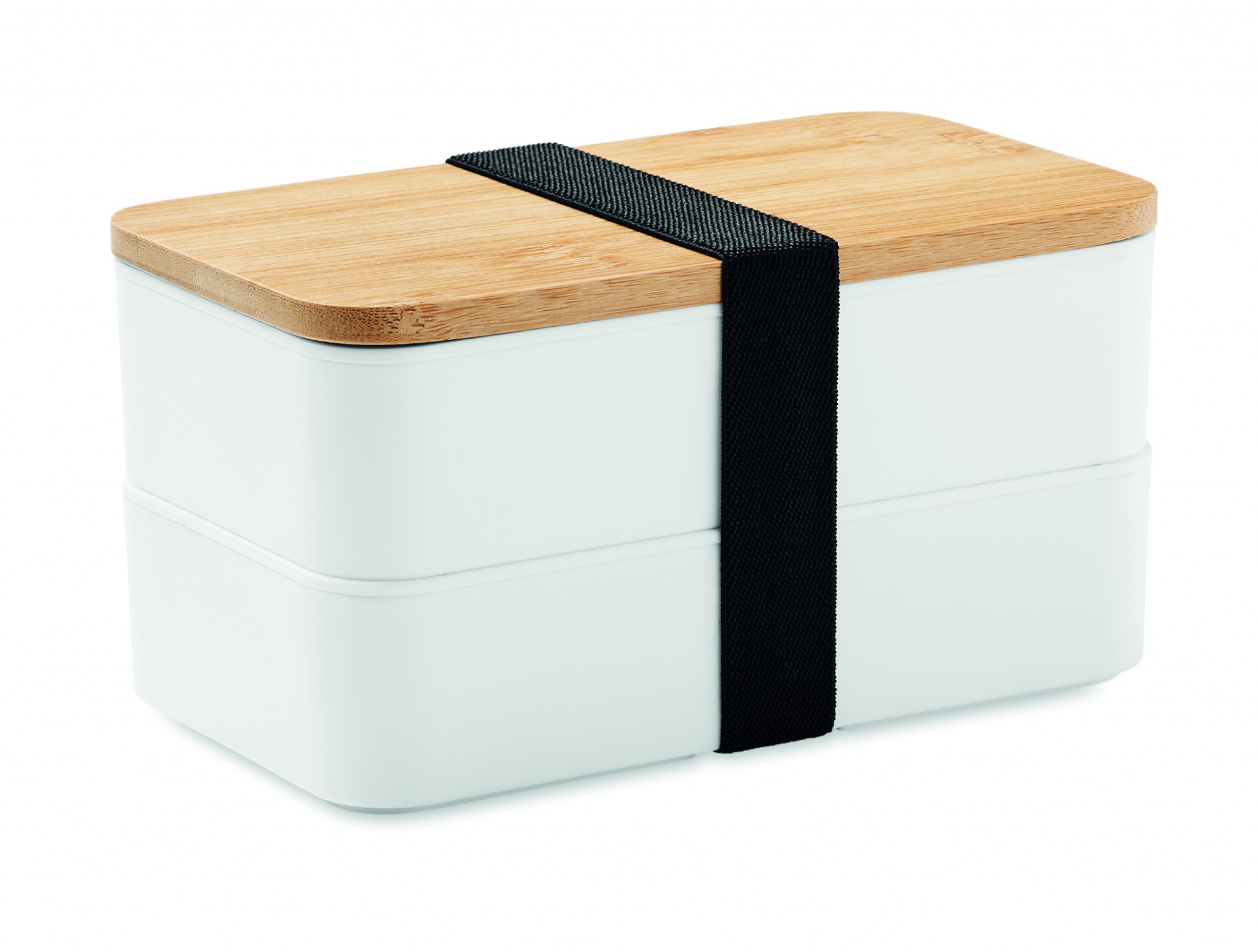 PP-kaksikerroksinen 400 ml lounaslaatikko bambu kannella, sisältää 3 ruokailuvälinettä.