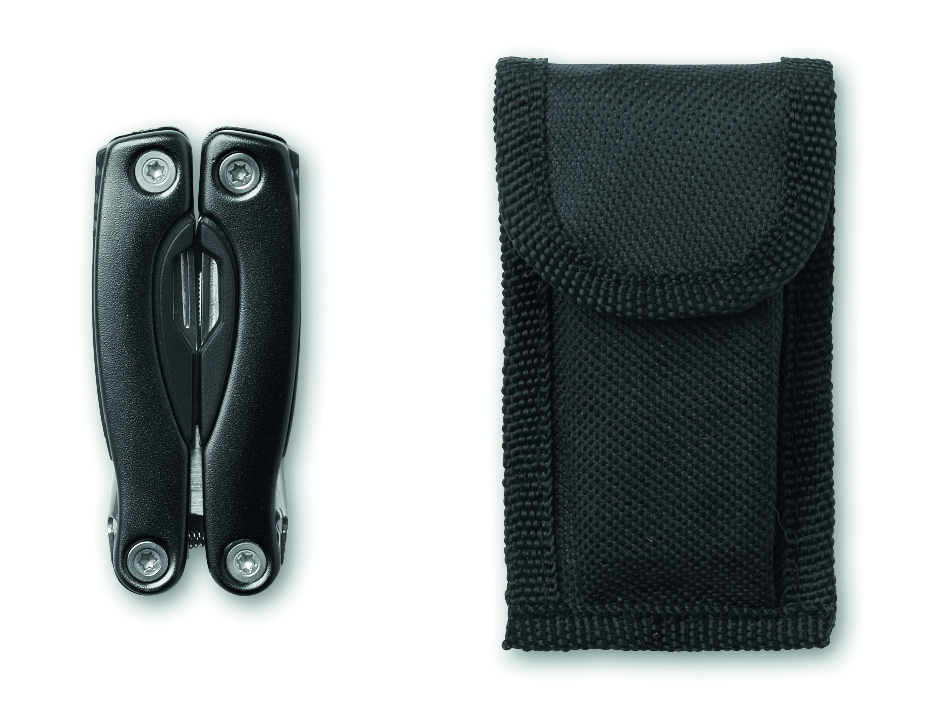 Ruostumattomasta teräksestä valmistettu monitoimityökalu, 9 työkalutoimintoa. Pakattuna 600D- polyesteriseen pussiin.