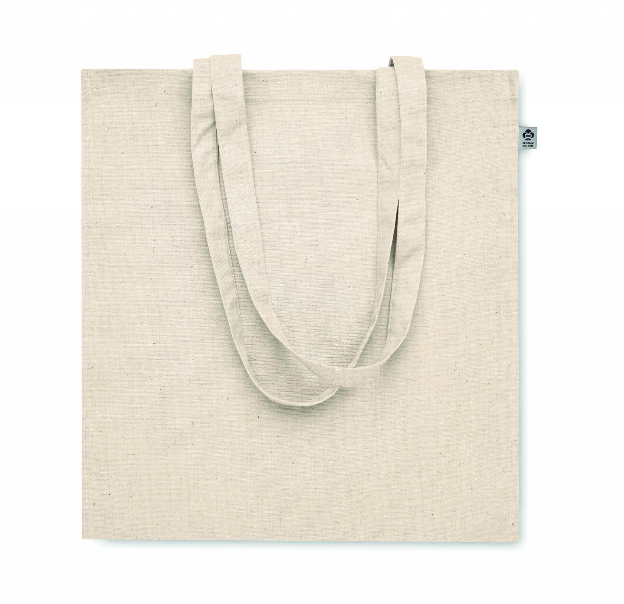 Luomupuuvillasta valmistettu ostoskassi, jossa on pitkät kahvat ja sivutaitteet. 220 gr/m².