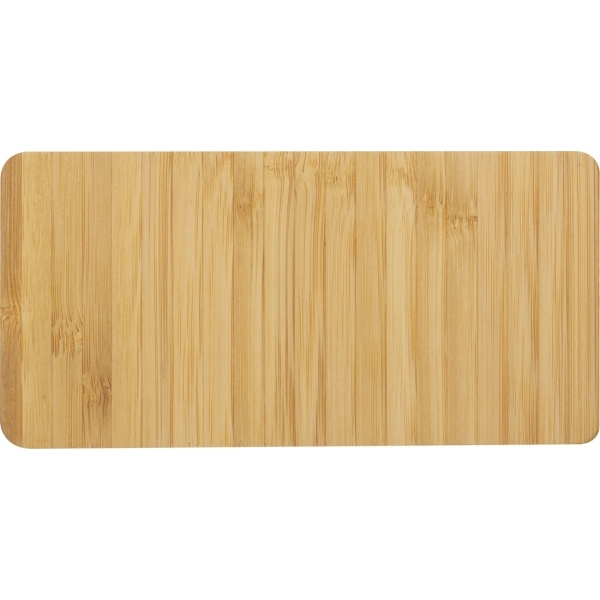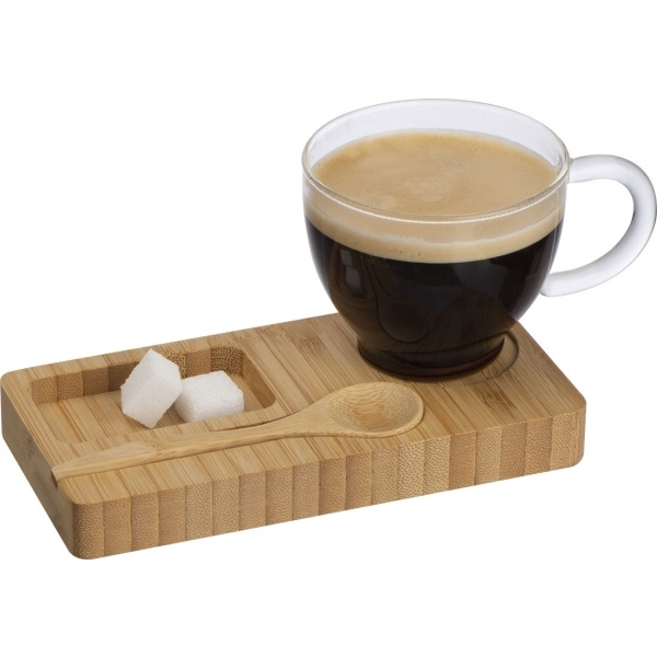 Bambutarjotin, jossa bambulusikka, boorisilikaattilasimuki (150ml) ja paikka sokerille tai suklaalle jne. Logosi kaiverretaan taululle.