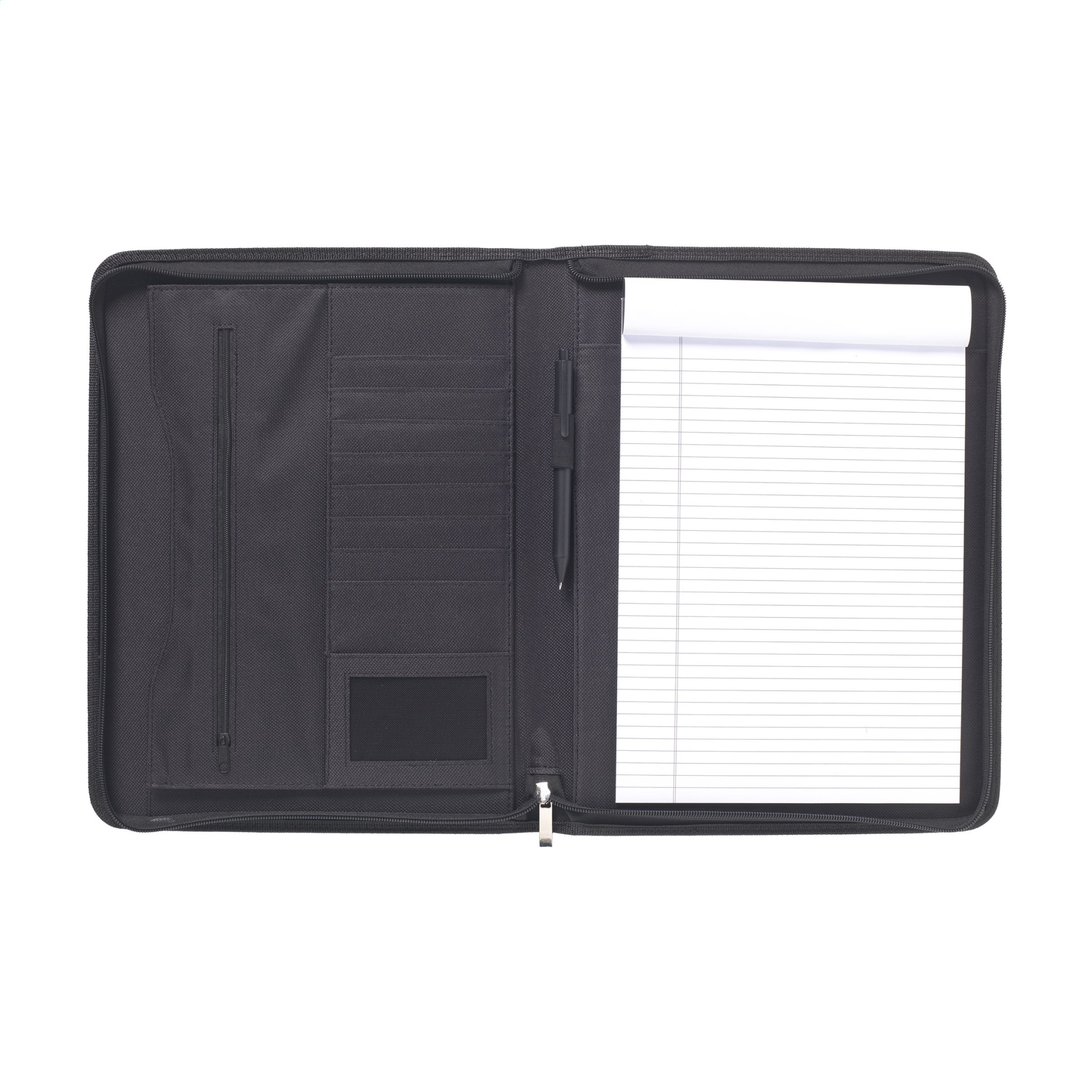 Neuvottelu-/asiakirjakansio hienosta, liimatusta nahasta A4-muodossa. Useita taskuja, käyntikorttipaikat ja vetoketju. Sisältää kirjoitusalusta ja kuulakärkikynä. Jokainen tuote on pakattu erikseen.