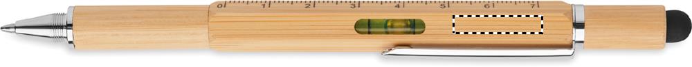 Kierrätetty vesivaakakynä bambusta sinisellä musteella ja 7 cm viivoittimella, stylus ja Phillips- ja litteäpäätyiset ruuvimeisselin päät.