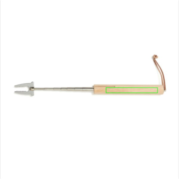 Teleskooppigrillitikku on omiaan avotulessa. Haarukan päissä väkäset, joiden ansiosta grillattava ei putoa tikusta. Puukahva. Kätevä nahkalenkki helpottaa ripustamista. Pituus ulosvedettynä n. 70 cm.