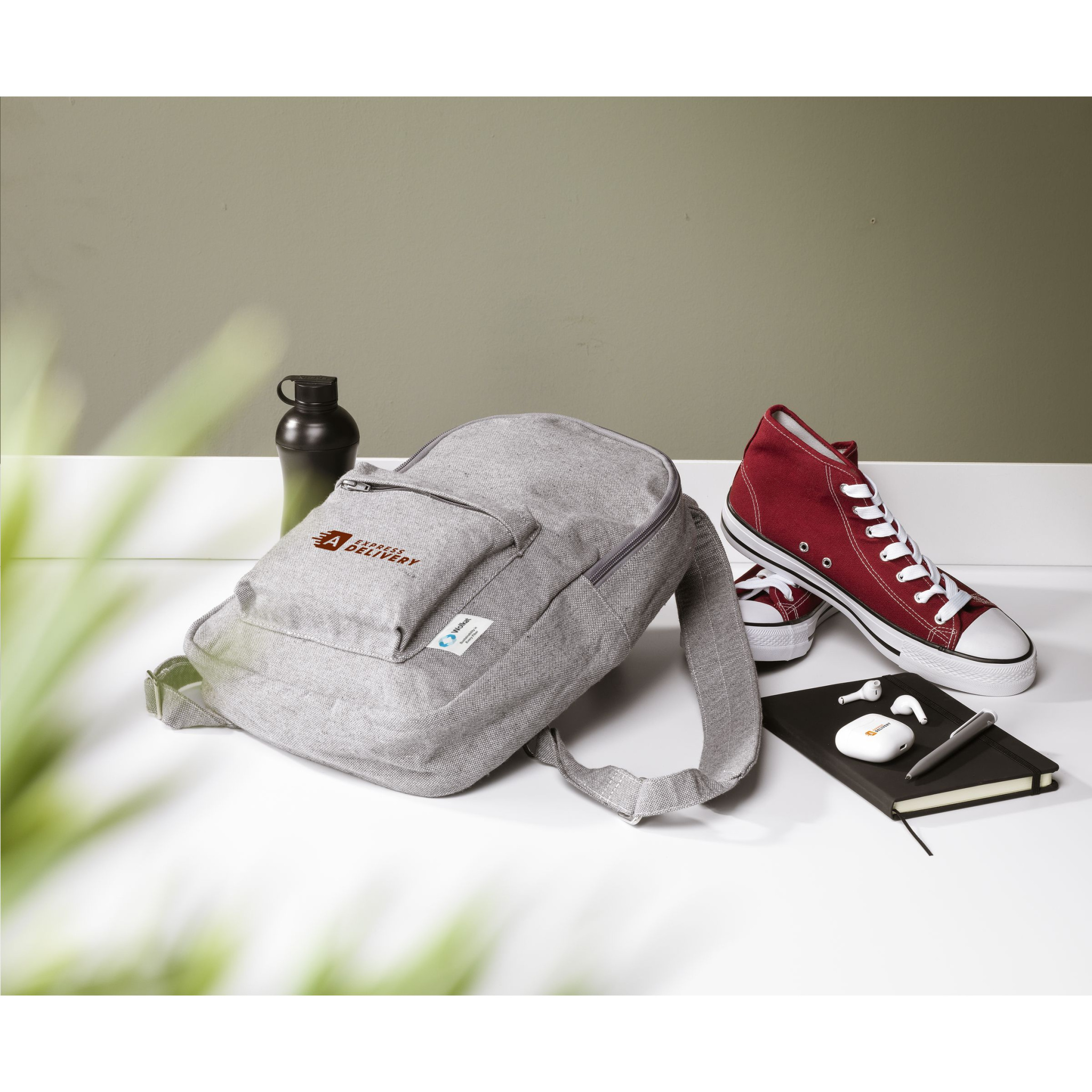 Reppu hollantilaiselta Wolkat-merkiltä. Valmistettu vanhoista ja käytöstä poistetuista vaatteista, kuluttajien lahjoittamat Hollannissa. Wolkatilla he hallitsevat koko prosessia keräyksestä, lajittelusta, kierrätyksestä, kehräyksestä ja kutomisesta - kaikki saman katon alla. Koko tekstiilien kierrätysprosessin aikana ei käytetä vettä, maalia tai kemikaaleja. Wolkat silppuaa ja kuiduttaa nämä tekstiilit puhtaiksi kuiduiksi, jotka sitten lähetetään omaan kehräämään, joka sijaitsee Marokossa. Tässä kehrässä kehrätään eripaksuisia ja -laatuisia lankoja. Tästä valmistetaan tuotteita, kuten tämä kestävä reppu, joka koostuu 52 % kierrätetyistä tekstiileistä ja 48 % RPET:stä. Varustettu tilavalla pääosastolla, ylimääräisillä vetoketjutaskuilla sisällä ja ulkopuolella sekä kantolenkillä. Säädettävissä olkahihnoissa on vahvistetut metallisoljet lisämukavuuden lisäämiseksi. Kapasiteetti n. 7,4 litraa.