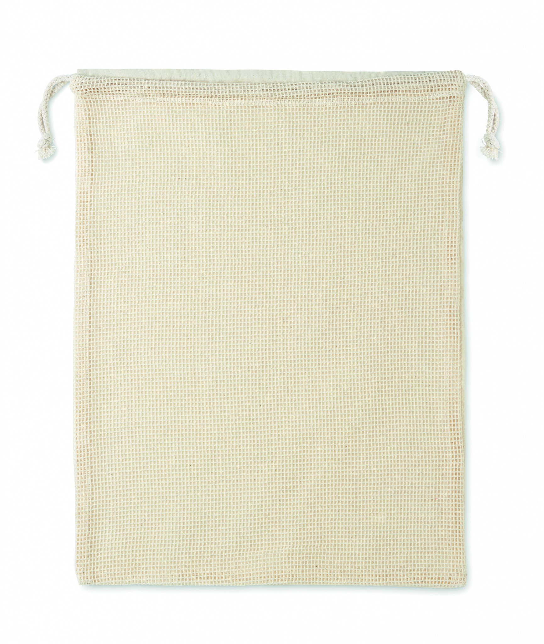 Daugkartinio naudojimo maisto maišelis. Viena pusė iš medvilnės (140gr/m²), o kita iš tinklinės medvilnės (110gr/m²). Užsegimas raišteliu.