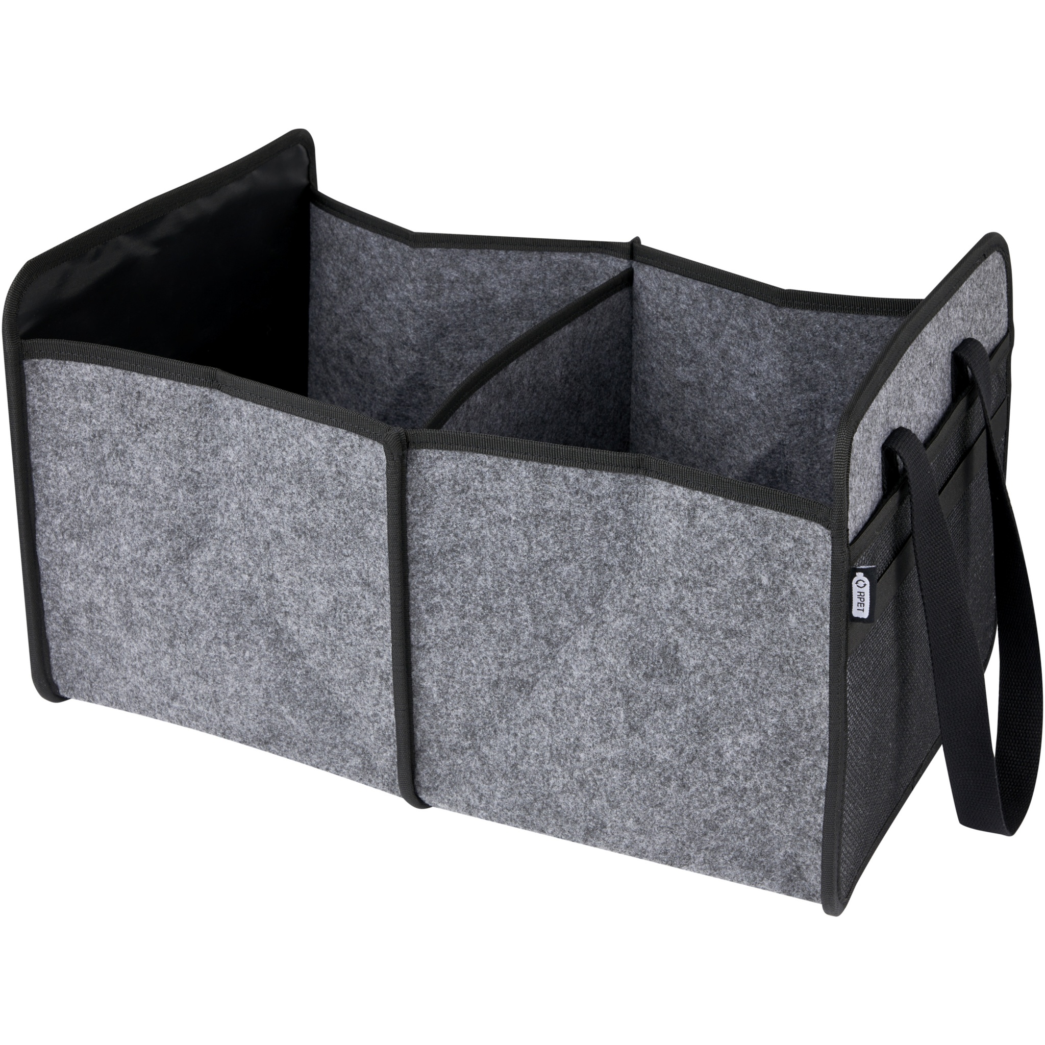 Sulankstomas bagažinės laikiklis pagamintas iš minkšto ir patvaraus aukštos kokybės GRS sertifikuoto perdirbto veltinio. Yra 2 dideli skyriai su sustiprintomis dugno plokštėmis, priekinė kišenė, tinklinė kišenė ir 2 ilgos austinės medvilninės rankenos (30 x 2,5 cm). Idealiai tinka laikyti elektromobilio įkrovimo laidus, neštis bakalėjos prekes ar tiesiog viską gerai sutvarkyti automobilyje ar namuose. Be jokių pastangų susilanksto į vietą, o elastingas dirželis užtikrina, kad jis liktų tvarkingai sulankstytas. Gylis uždarytas: 4,5 cm. Gylis atidarytas: 48 cm.