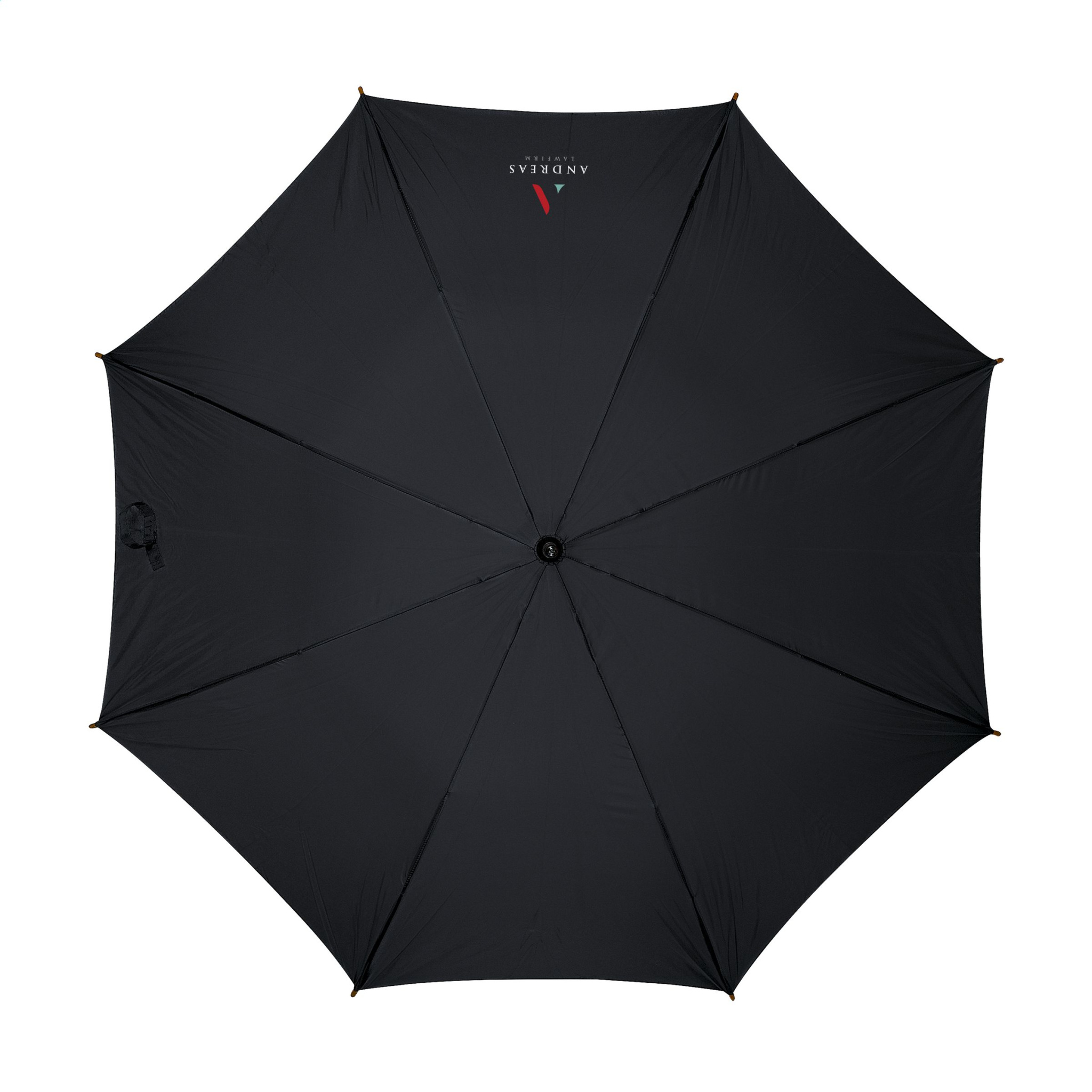 Skėtis su automatiniu teleskopiniu atidarymu, 190T poliesterio stogeliu, metaliniu rėmu, mediniu kotu ir rankena bei velcro užsegimu.