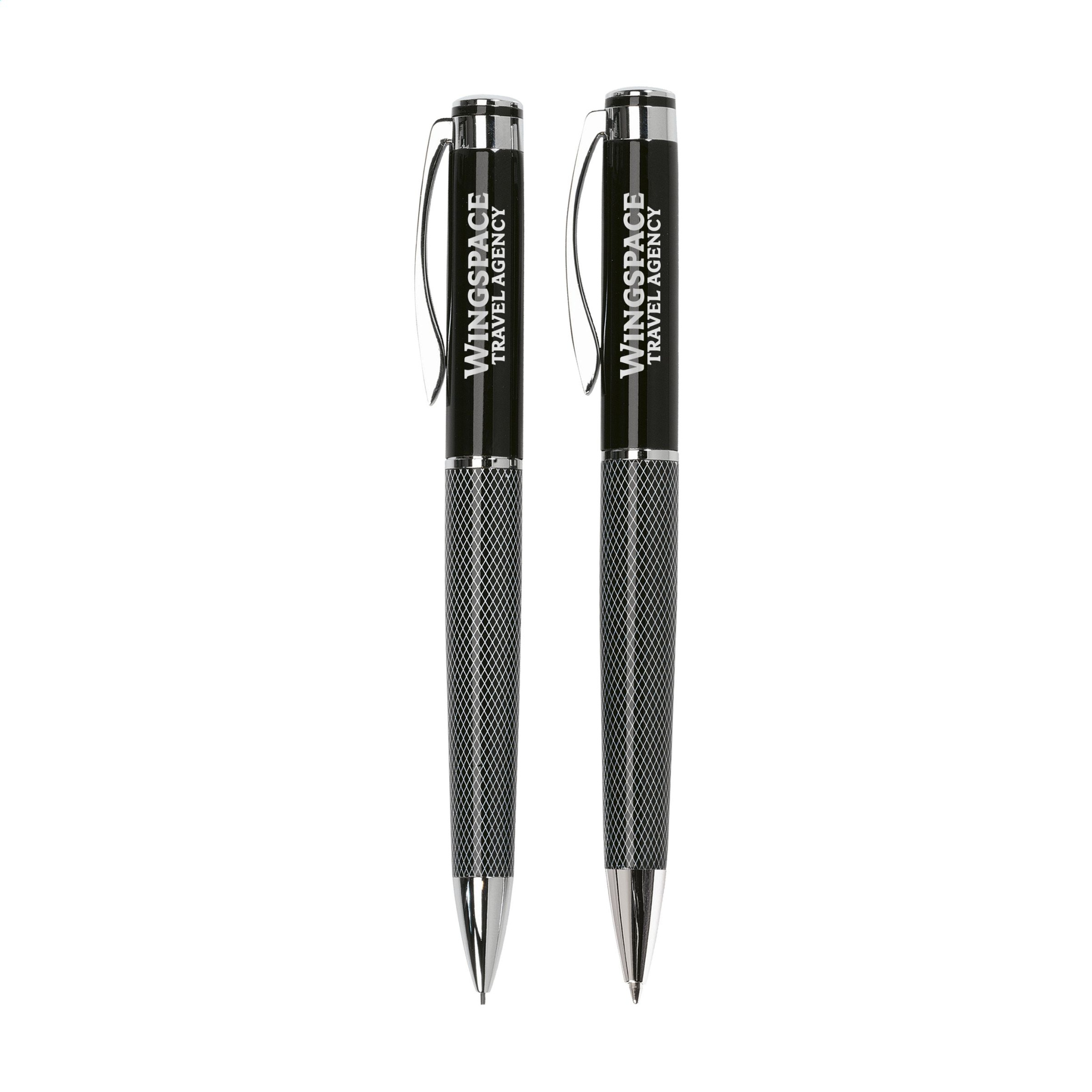 Rašymo rinkinys: mėlyno rašalo tušinukas su pasukamu antgaliu ir pakartotinai užpildomas pieštukas su 3 HB užpildais (0,9 mm). Abu su metaliniais apvadais. Atveju.