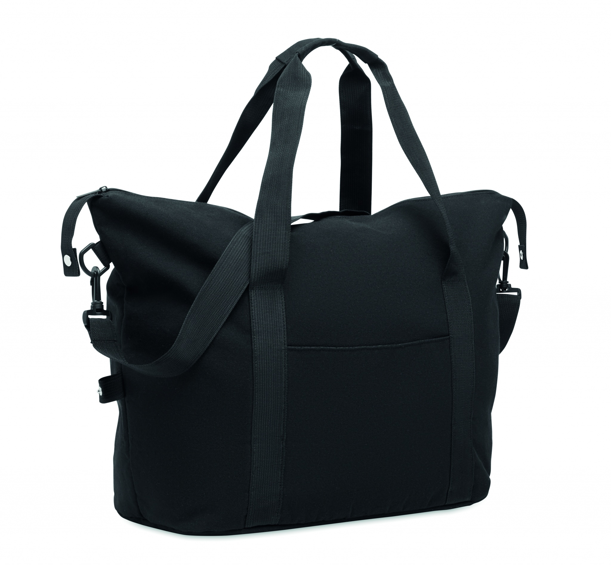 Savaitgalio krepšys iš perdirbtos medvilnės ir perdirbto poliesterio (70%/30%) su 210D RPET poliesterio pamušalu. Turi priekinę slydimo kišenę, užtrauktuku užsegamą galinę kišenę, nuimamą ir reguliuojamą pečių dirželį ir paminkštintą apačią. Vežimėlio laikiklis galinėje pusėje.