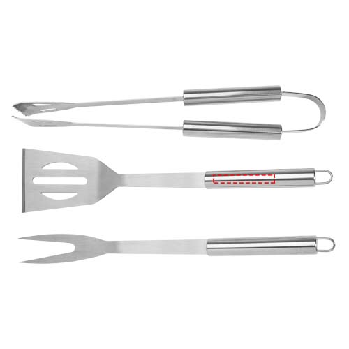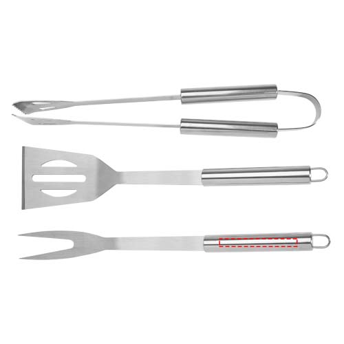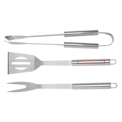 3-daļīgs BBQ komplekts ar lāpstu (34,8 x 7,5 cm), dakšiņu (35,4 x 3,35 cm) un knaibles (35 x 6,8 x 4 cm). Visi piederumi tiek piegādāti vieglā maciņā, lai tos būtu viegli pārnēsāt un uzglabāt. Ideāls BBQ aksesuārs dārzam vai ņemšanai līdzi āra grilēšanai ar draugiem un ģimeni.