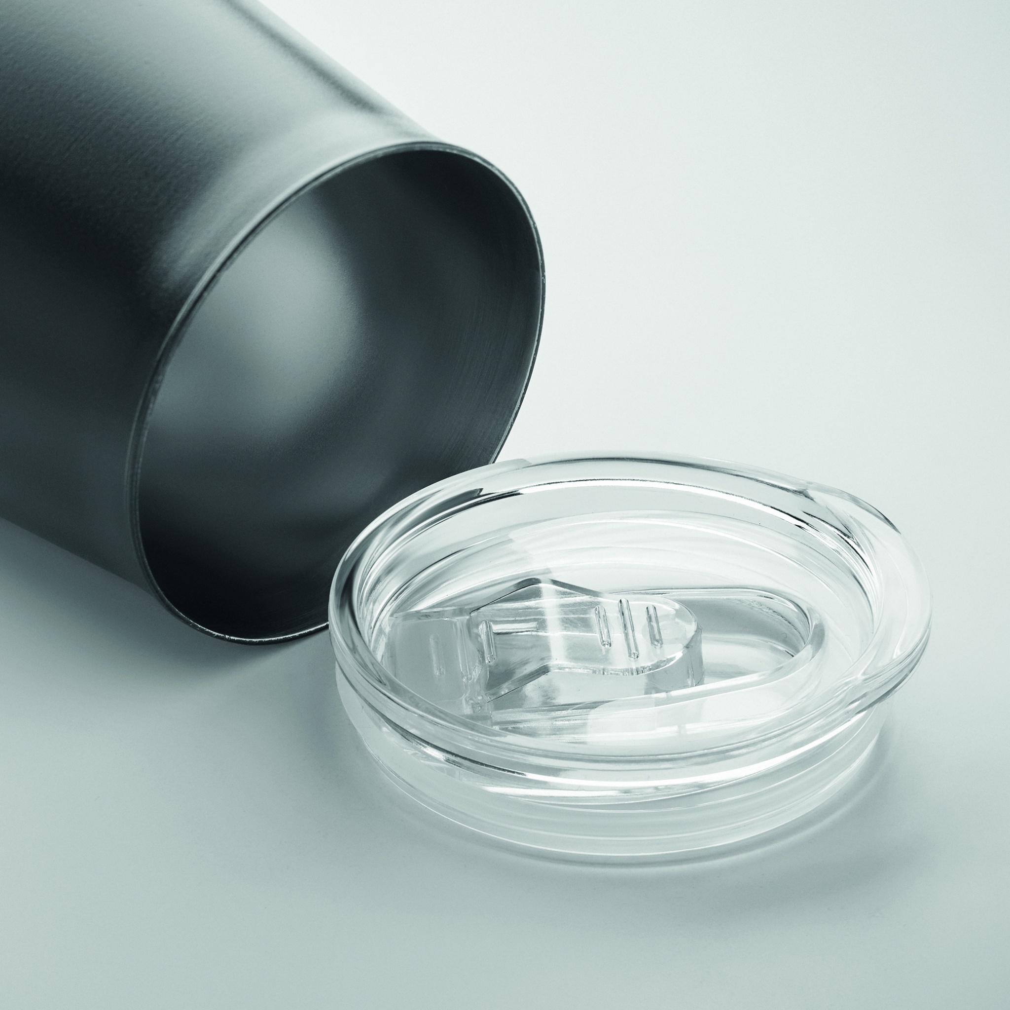 Pārstrādāta nerūsējošā tērauda (90% pārstrādāta nerūsējošā tērauda un 10% nerūsējošā tērauda) krūze ar pulvera pārklājumu ar vāku ar bīdāmu malkas atveres vāku. Tilpums: 500 ml. Tā kā šī krūze ir ar vienu sienu, siltuma pārnese joprojām var notikt.