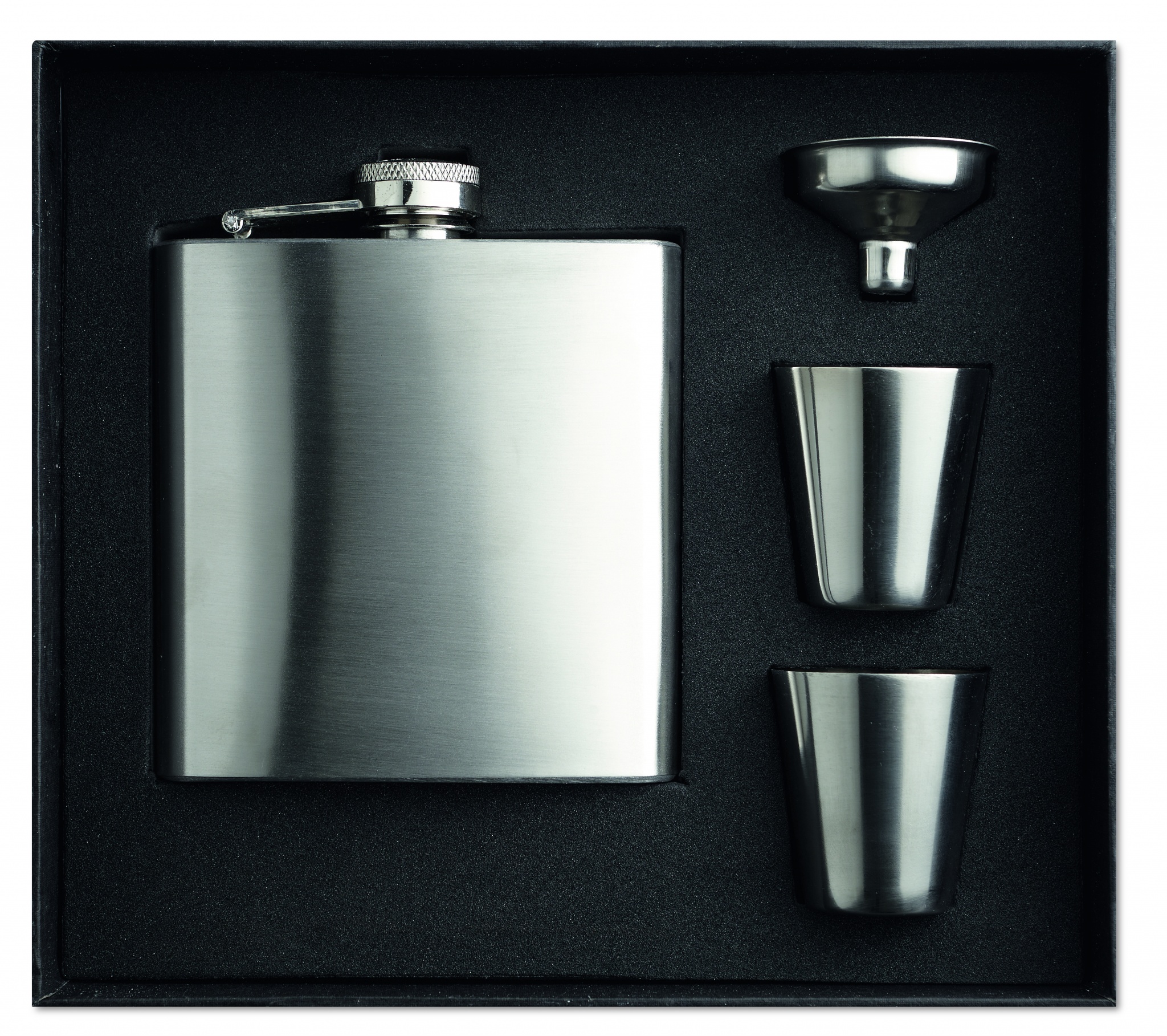 Slaida gurnu kolba. Satīna apdare, vienslāņa 175 ml. Ar 2 krūzēm un pudeles kaklu, kas ir melnā dāvanu kastītē.