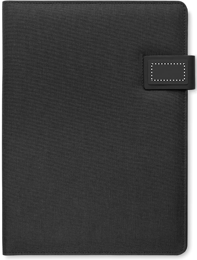 A4 conference folder with linen-PU cover. 5000 mAh power bank and 15W magnetic wireless charger. 20 lined sheets notepad. Multiple internal compartments. Magnetic closure. Elastic pen holder.