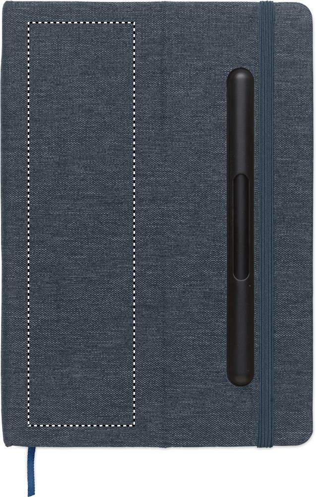 A5 notebook with RPET hard cover with phone holder functionality. Integrated 2-in-1 inkless and regular ballpen in ABS. Casebound. 192 recycled paper lined pages (96 sheets). Matching strap and bookmark.