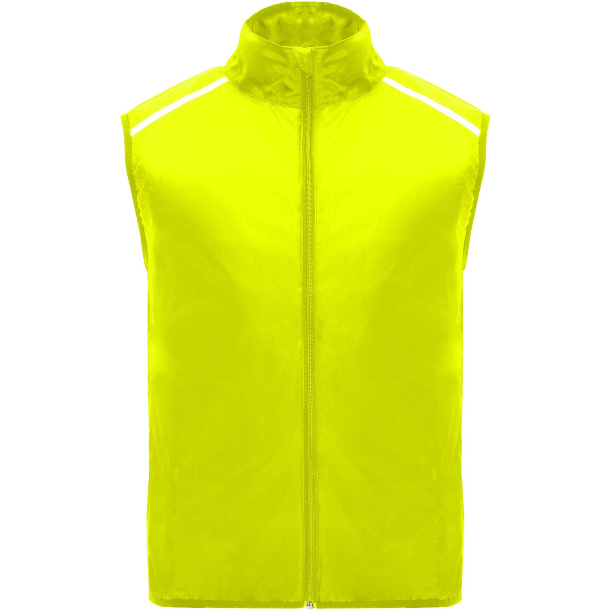 Ветрозащитный и дышащий. Передняя молния с защитой подбородка в тон. Эластичная окантовка в пройме и по низу. Нижняя часть спины из ткани с микроперфорацией. Яркие детали сверху, спереди и сзади. Карман с эластичным ремешком, позволяющий сложить жилет и носить его на запястье. Съемная этикетка.