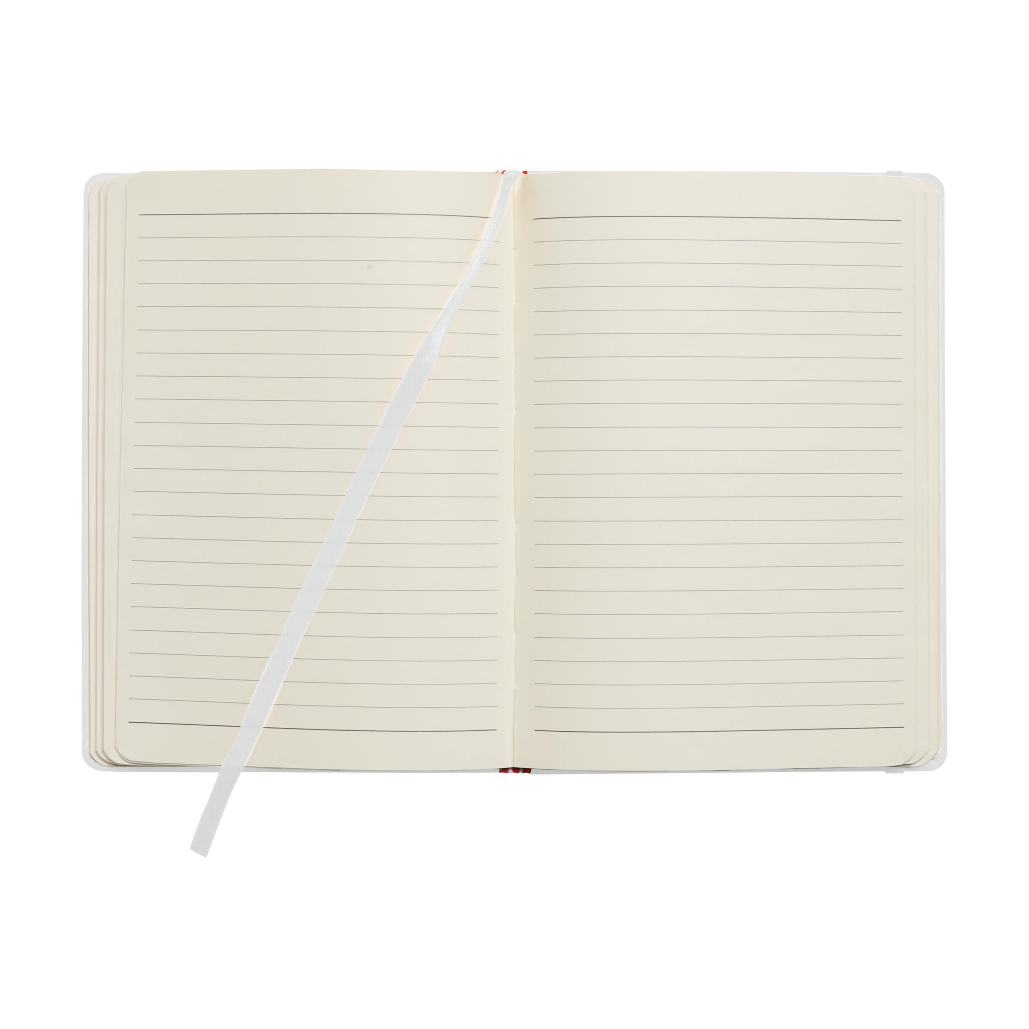 Тетрадь формата А4 на 96 листов/196 страниц кремовой линованной бумаги (80 г/м²). С клеевым переплетом, твердой обложкой, эластичной застежкой и шелковой лентой.