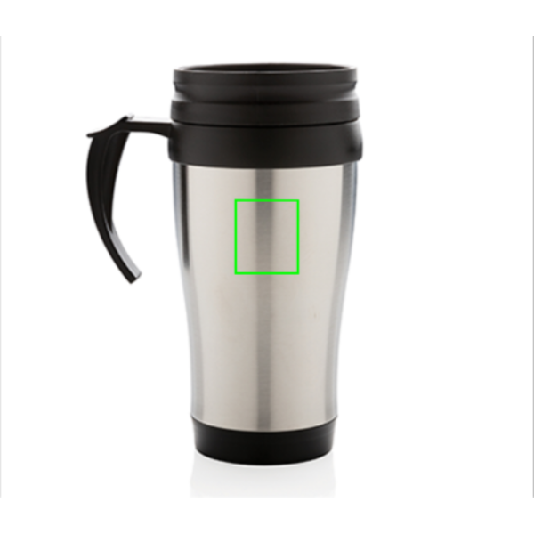 Кружка объемом 350 мл из нержавеющей стали снаружи и полипропилена внутри с крышкой и основанием черного цвета.